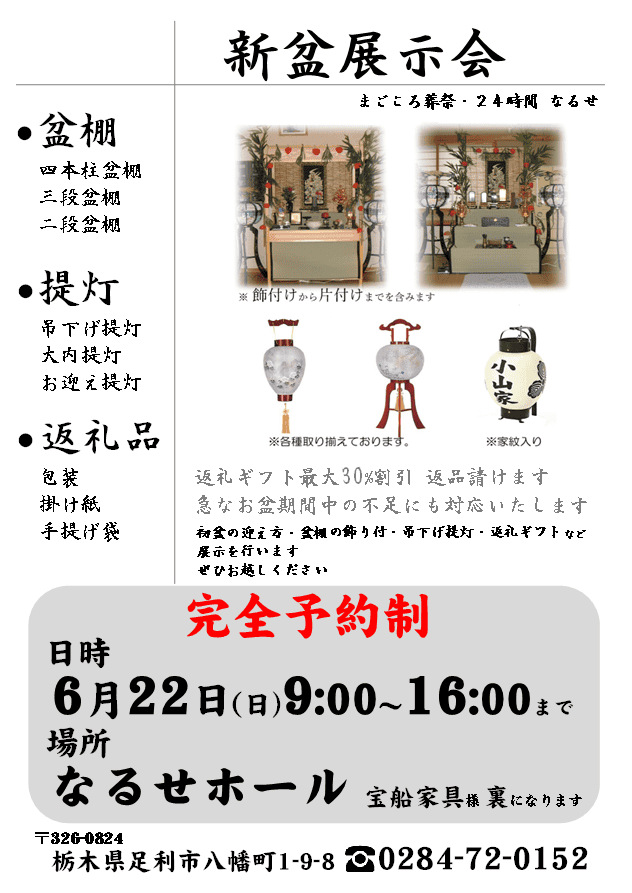 実際に棚を飾っている様子や、吊り下げ提灯、返礼ギフトなどご覧いただきたいと思っています。                       完全予約制になっていますので来られる方はお早めにご連絡ください。1組30分ほどのご説明になります。            新盆ではなくても飾って差し上げたいご家族や、他で葬儀をあげられたご家族もお手伝いできることがあればご相談ください。