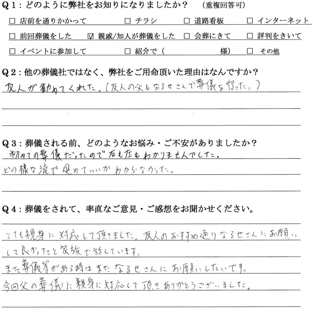 とても親身に対応して頂きました。友人のおすすめ通りなるせさんにお願いして良かったと家族で話しています。 また葬儀等がある時はまたなるせさんにお願いしたいです。 今回父の葬儀に親身に対応して頂きありがとうございました。