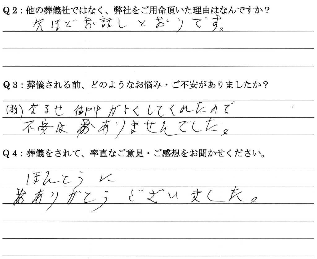 なるせ御中がよくしてくれたので不安はありませんでした 投稿日 2025年4月23日 著者 まごころ葬祭・なるせ カテゴリー ご家族の声 Q:他の葬儀社ではなく、弊社をご用命頂いた理由はなんですか。 先ほどお話ししたとおりです。 Q:葬儀される前、どのようなお悩み・ご不安がありましたか。 ㈱なるせ御中がよくしてくれたので不安はありませんでした Q:葬儀をされて、率直なご意見・ご感想をお聞かせください。 ほんとうにありがとうございました。