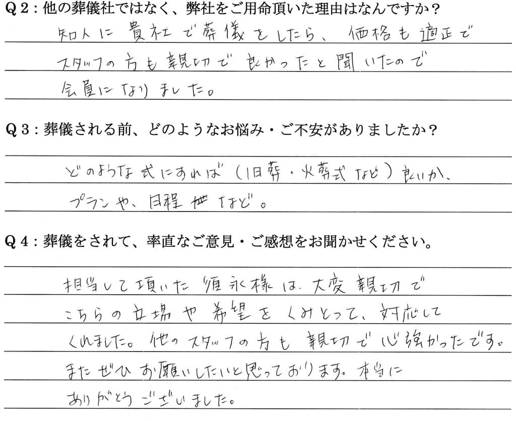 Q:他の葬儀社ではなく、弊社をご用命頂いた理由はなんですか。