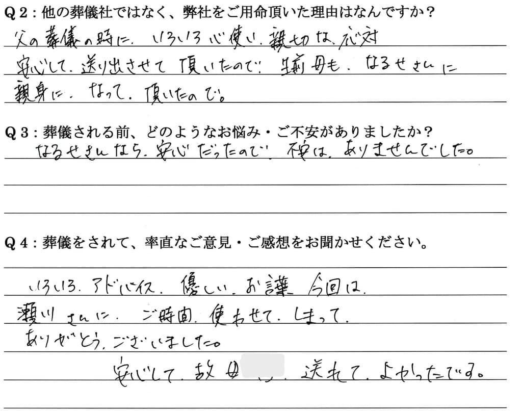 父の葬儀の時に、いろいろ心使い、親切な対応、安心して送り出させて頂いたので。 生前母も、なるせさんに親身になって頂いたので。