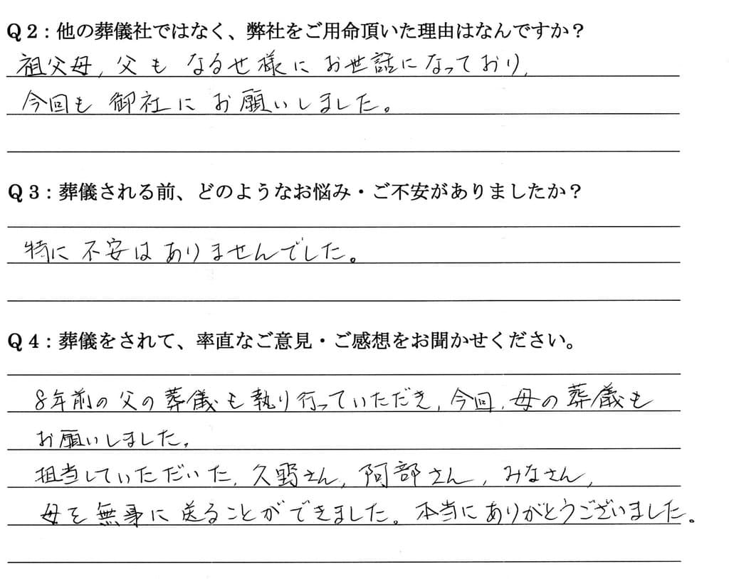 8年前の父の葬儀も執り行っていただき、今回母の葬儀もお願いしました。 担当していただいた、久野さん、阿部さん、みなさん、母を無事に送ることができました。本当にありがとうございました。