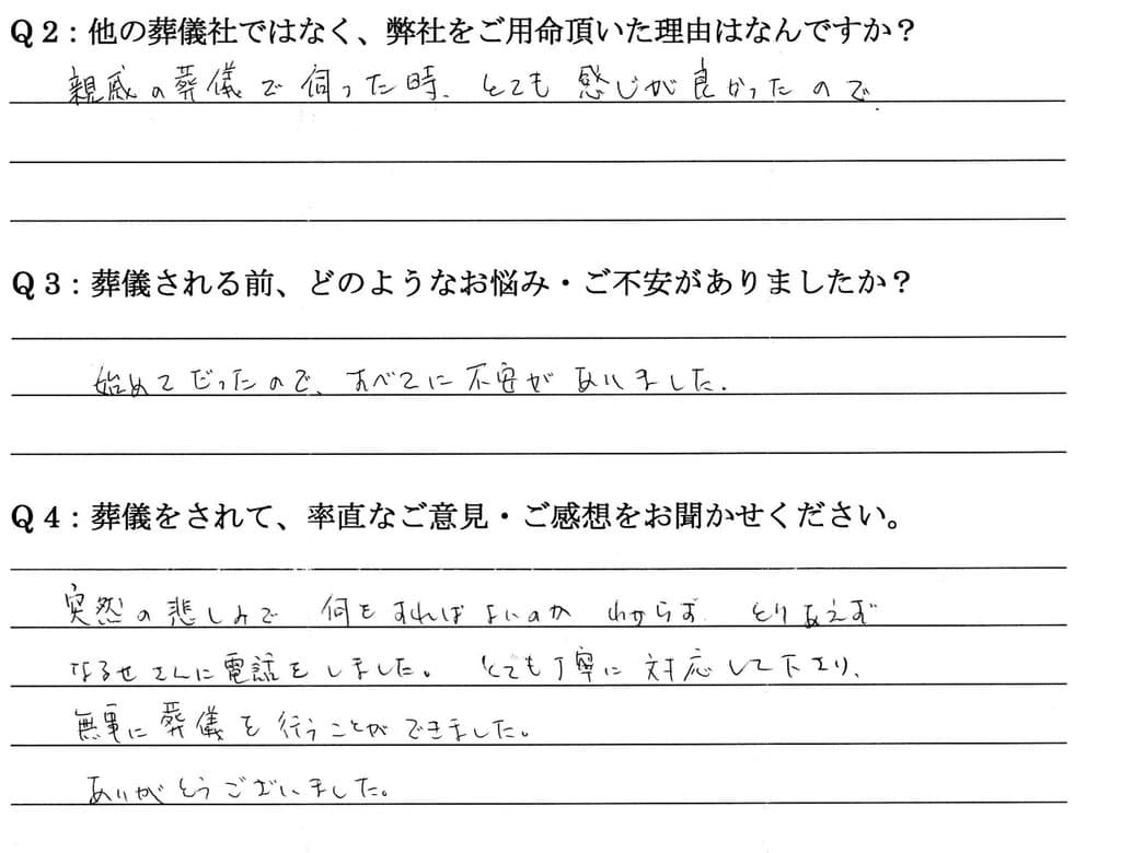突然の悲しみで何をすればよいのかわからず、とりあえずなるせさんに電話をしました。 とても丁寧に対応してくださり、無事に葬儀を行うことができました。ありがとうございました。