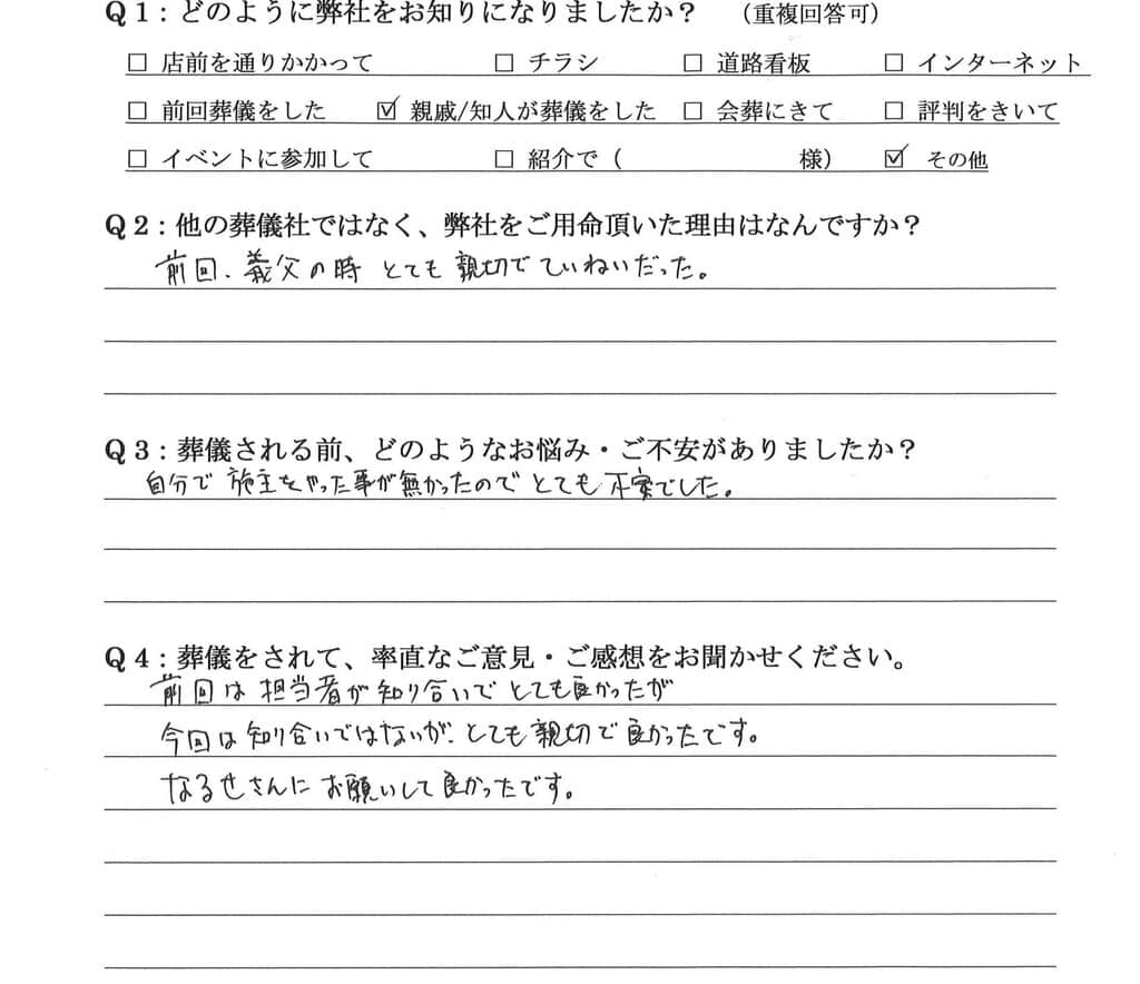 Q:他の葬儀社ではなく、弊社をご用命頂いた理由はなんですか