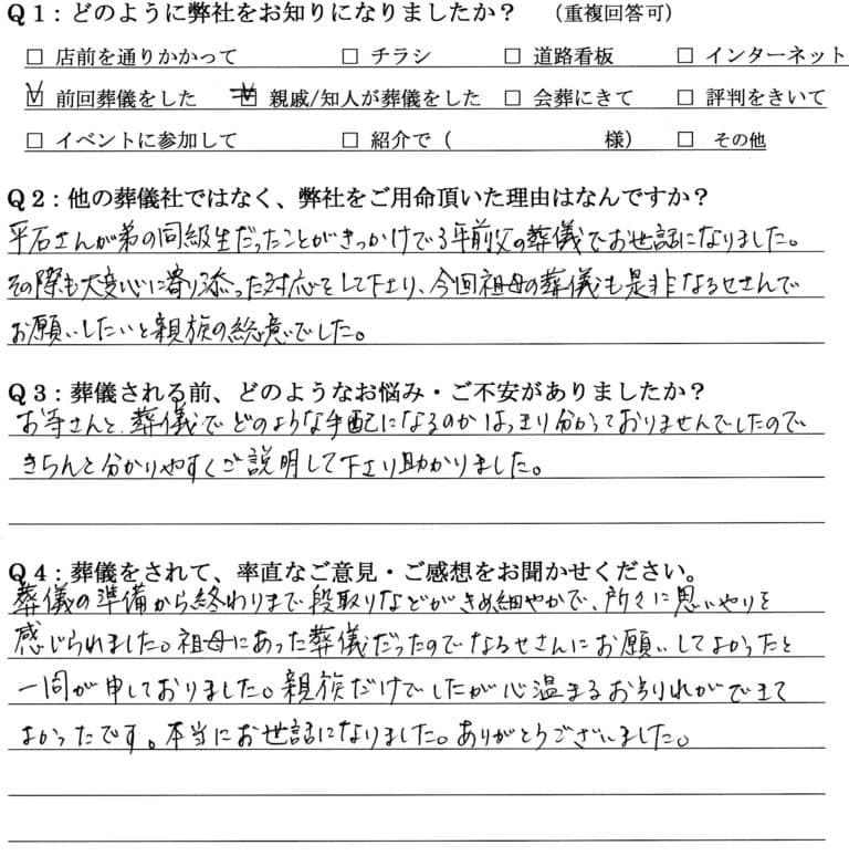 Q:他の葬儀社ではなく、弊社をご用命頂いた理由はなんですか。