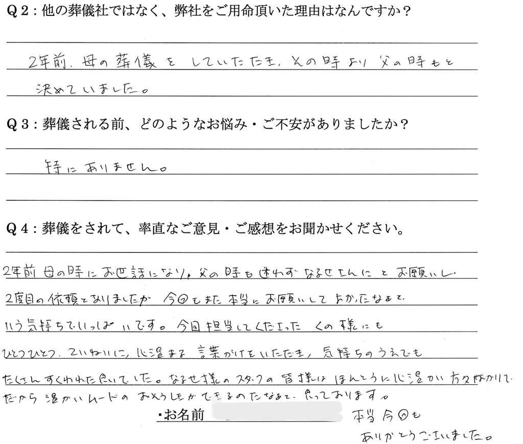 2年前母の時にお世話になり、父の時も迷わずなるせさんにとお願いし、2度目の依頼となりましたが、 今回も本当にお願いして良かったなぁという気持ちでいっぱいです。今回担当してくださった、 くの様にもひとつひとつていねいに心温まる言葉がけをいただき、気持ちのうえでもたくさんすくわれた思いでした。 なるせ様のスタッフの皆様はほんとうに心温かい方々ばかりで、だから温かいムードのおそうしきができるのだなぁと思っております。本当今回もありがとうございました。