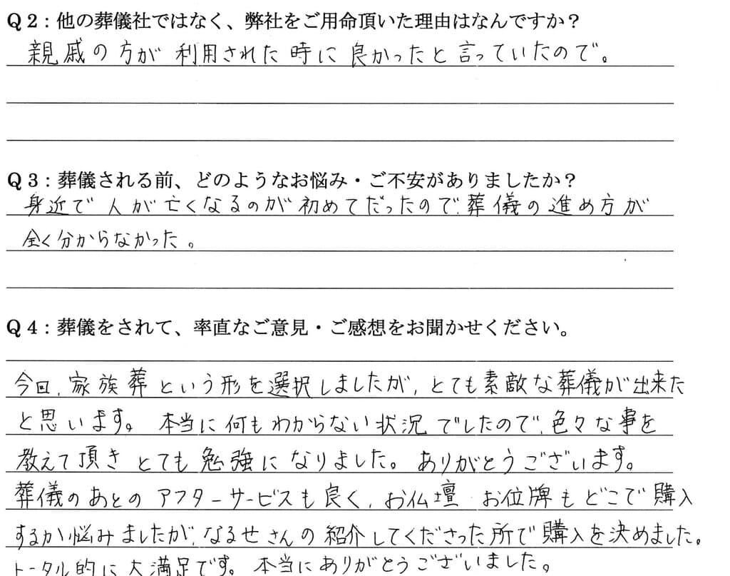 今回、家族葬という形を選択しましたが、とても素敵な葬儀が出来たと思います。 本当に何もわからない状況でしたので、色々な事を教えて頂きとても勉強になりました。ありがとうございます。 葬儀のあとのアフターサービスも良く、お仏壇・お位牌もどこで購入するか悩みましたが、 なるせさんの紹介してくださった所で購入を決めました。トータル的に大満足です。 ほんとうにありがとうございました。