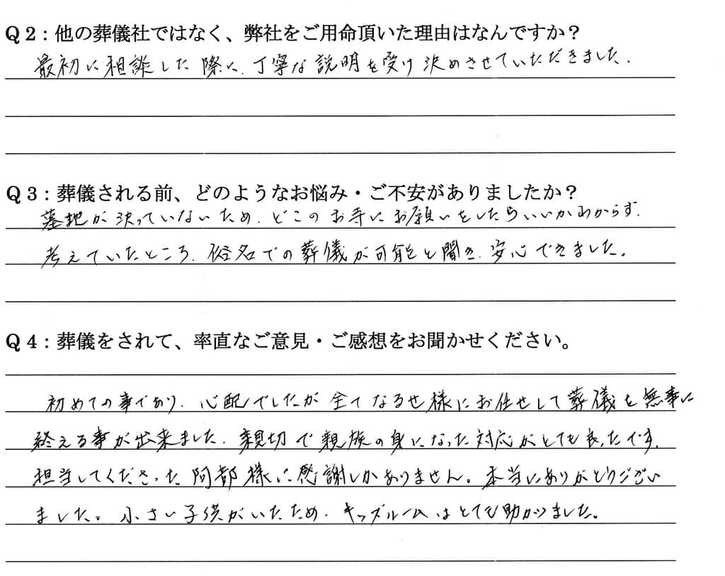 墓地が決まっていないため、どこのお寺にお願いをしたらいいかわからず、考えていたところ、 俗名での葬儀が可能と聞き安心できました