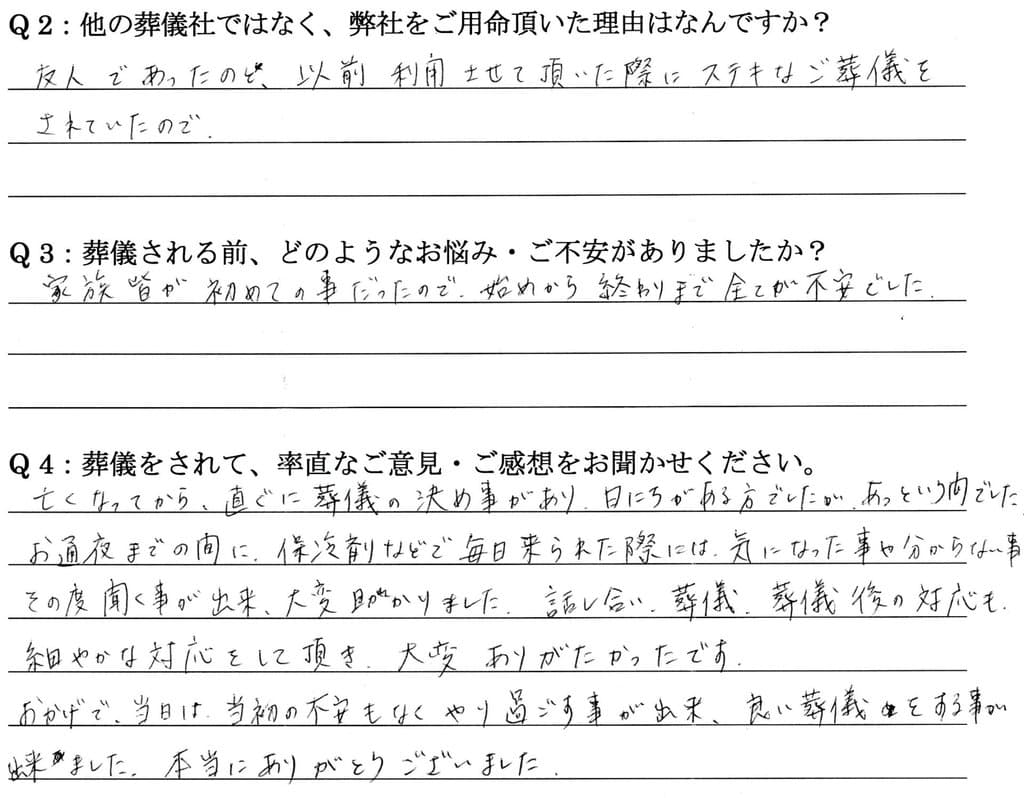 亡くなってから、直ぐに葬儀の決め事があり、日にちがある方でしたが、あっという間でした。 お通夜までの間に、保冷剤などで毎日来られた際には、気になった事や分からない事をその度聞くことが出来、大変助かりました。話し合い、葬儀、葬儀後の対応も、細やかな対応をして頂き、大変ありがたかったです。 おかげで、当日は当初の不安もなく、やり過ごす事が出来、良い葬儀をする事が出来ました。本当にありがとうございました。