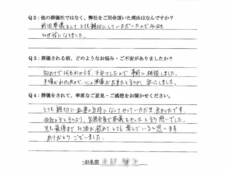 死亡から葬儀、その後まで非常に丁寧に対応していただきました。親族で車いす使用者がいましたが、その方も「葬儀屋さんがいろいろ助けてくれた」と言ってました。