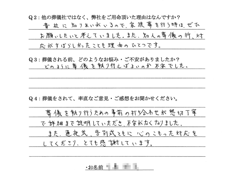 Q:他の葬儀社ではなく、弊社をご用命頂いた理由はなんですか。