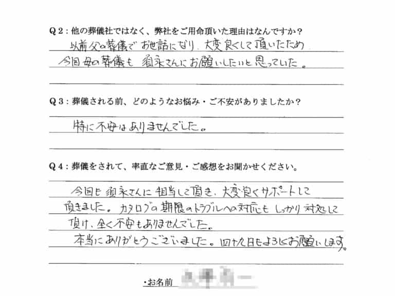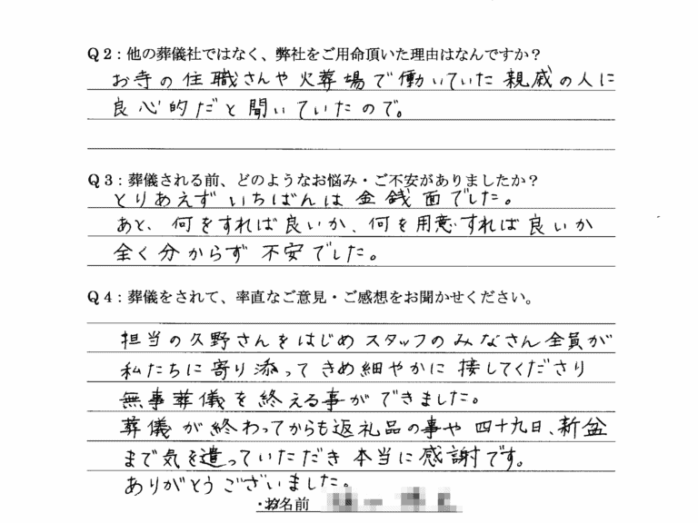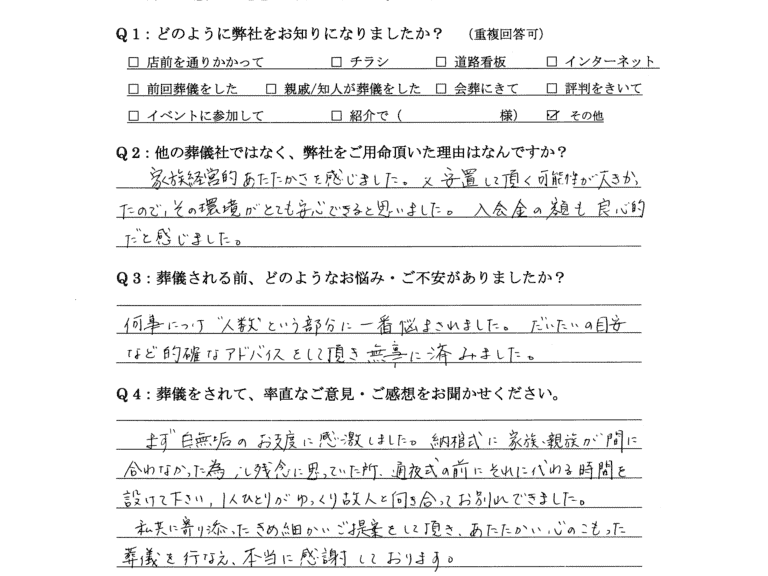 Q:他の葬儀社ではなく、弊社をご用命頂いた理由はなんですか。