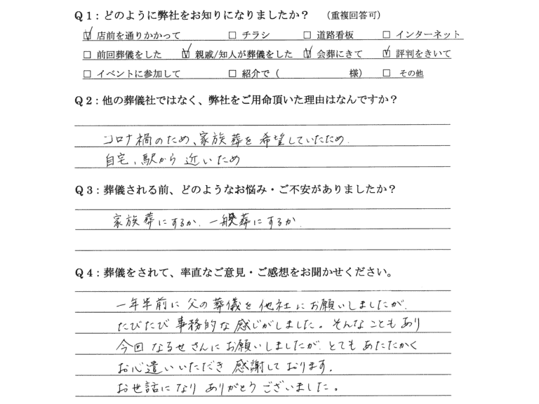 何もわからず困っていました。夜遅くまで来ていただきありがとう御座いました。 投稿日 2021年4月26日 更新日 2021年5月10日 著者 まごころ葬祭・なるせ カテゴリー ご家族の声 Q:他の葬儀社ではなく、弊社をご用命頂いた理由はなんですか。 わかりやすく説明し又 親切です。 Q:葬儀される前、どのようなお悩み・ご不安がありましたか。 Q:葬儀をされて、率直なご意見・ご感想をお聞かせください。 何もわからず困っていました。夜遅くまで来て戴き ありがとう御座いました。