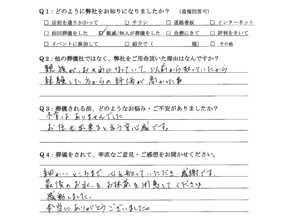 Q:他の葬儀社ではなく、弊社をご用命頂いた理由はなんですか。