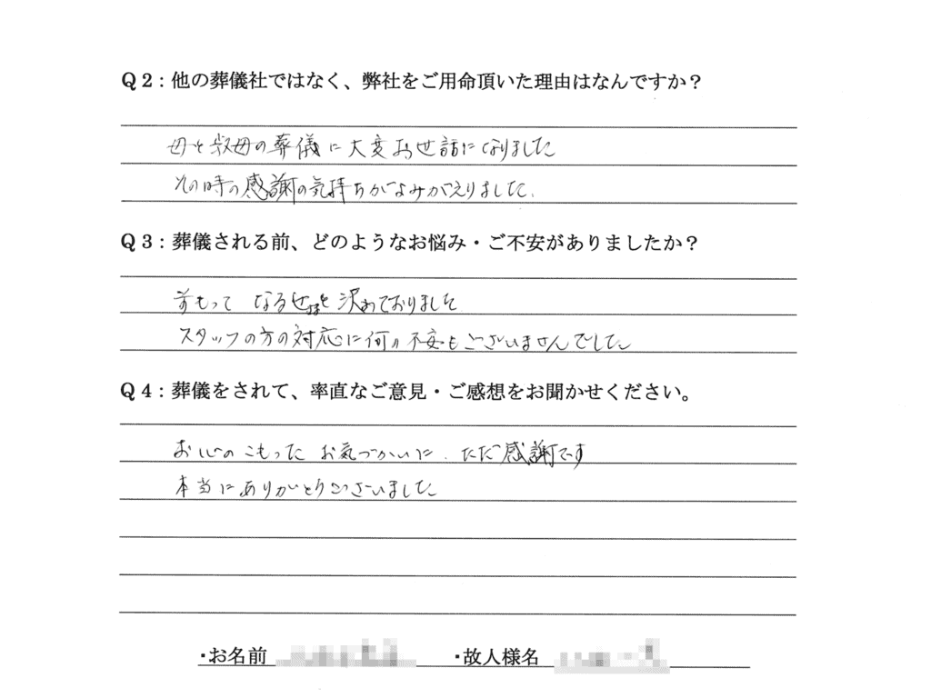 Q:他の葬儀社ではなく、弊社をご用命頂いた理由はなんですか。