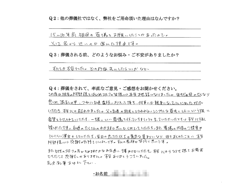 この度は担当の阿部様をはじめスタッフの皆様には本当お世話になりました。突然母が亡くなり悲しみ、混乱の中、つねに私達遺族によりそって頂き何事にも親身になって心のこもった対応いただき本当 心が救われました。父と私達の形式にとらわれないシンプルな葬式にしたいという強い希望をうけ入れていただき、一緒にいい葬儀を作っていきましょうと言っていただいたときは本当心強く嬉しかったです。私達のたくさんのわがままも思いもくみとっていただき、また葬儀の内容のご提案や心にくい演出もしていただき、当日は思っていた以上の素適なな集りになり、母をおくれたことに本当 阿部様には感謝の気持ちでいっぱいです。私の家族も皆同じ思いです。