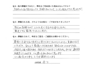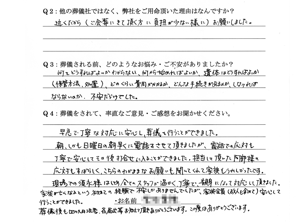朝、しかも日曜日の朝早くに電話させていただきましたが、電話での対応も丁寧で安心してその後打合せに入ることができました。担当の阿部様の対応もすばらしく、こちらのわがままなお願いも聞いてくれて家族もうれしかったです。現場での須永様はじめ全てのスタッフが温かく丁寧で、親身になって対応して頂きました。家族が亡くなるという初めての経験で不安しかありませんでしたが、家族全員(故人も含めて)安心して行うことができました。葬儀後も四十九日法要、各届出等教えて頂きありがとうございます。この度はありがとうございます。